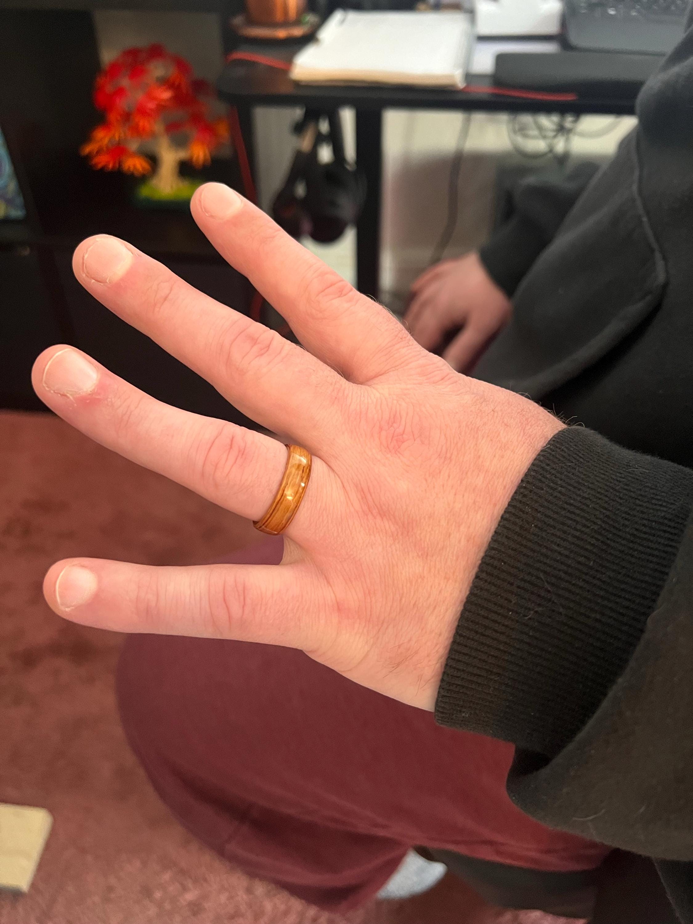 A: Our rings are handcrafted from responsibly sourced hardwoods, sealed with a durable cyanoacrylate (CA) coating. They resist normal wear but may chip or crack under extreme impact. For coating issues (e.g., peeling), repairs are $80 per ring. Wood or inlay damage requires a new ring purchase. Contact us for details.